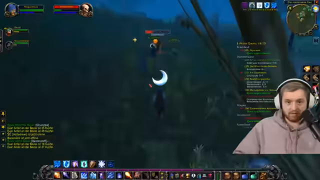 01:31:49Das Team macht sich auf, eine gefährlichere Zone im Demmerwald zu erkunden. Die Gegner dort sind deutlich höher levelt, was für die Gruppe eine Herausforderung darstellt. Sie koordinieren sich, um nur kontrolliert Mobs zu pullen und Überforderung zu vermeiden. Ein Priester schaltet einen massiven Ausdauer-Buff frei, der das Überleben in der gefährlichen Zone signifikant erhöht.