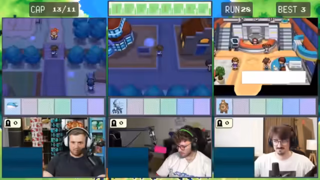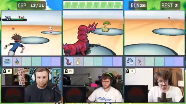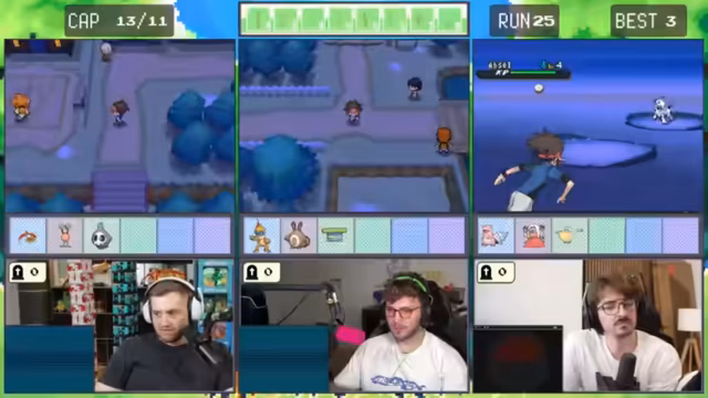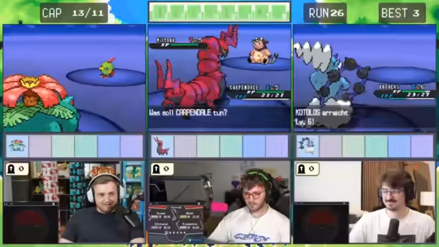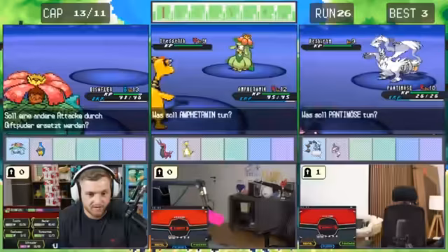 02:13:55Der Streamer wechselt zum Spielmodus 'Trio Soul Link' in Pokémon. Es ist der 25. Versuch, die Arena Leiter-Challenge zu meistern, der bisher erfolglos blieb. Die Spieler teilen ihre Pokémon-Teams und treffen auf schwache Gegner. Trymacs ist übermotiviert und wirft sich Fehler bei der Fangauswahl und im Kampf vor. Er kritisiert die的四倍弱点 von manchen Pokémon und deren Folgen für den Spielverlauf.