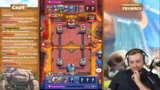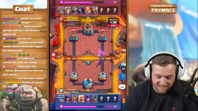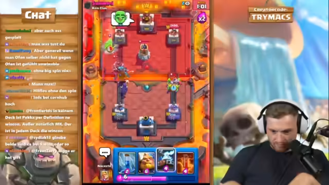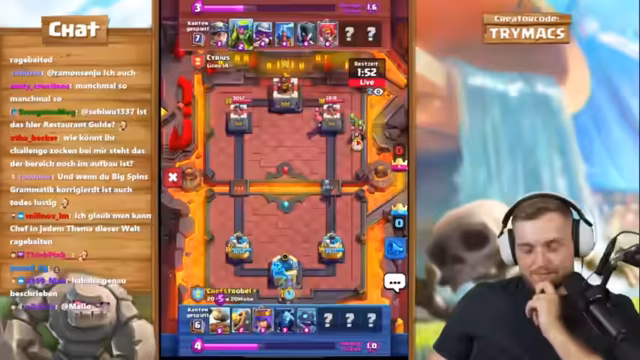 00:43:07Nachdem Chef Strobel sein erstes Spiel mit 3-0 gewonnen hat, setzt sich das Duell fort. Beide Spieler klagen über das schlechte Matchmaking. Der Streamer ist frustriert über einen Gegner mit nur 4.000 Trophäen, der jedoch sehr stark spielt. Beim Drafting gerät er in eine schwierige Situation, da ihm wichtige Karten wie der Bombenturm fehlen und er sich gezwungen sieht, suboptimalere Picks zu wählen, um ein funktionsfähiges Deck zusammenzustellen. Chef Strobel nutzt die Gelegenheit, um früh in Führung zu gehen und den Druck auf den Streamer zu erhöhen.