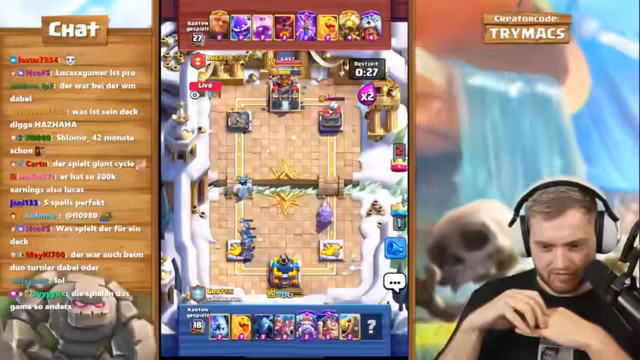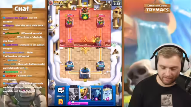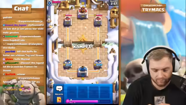 02:10:03Der Streamer startet eine Session des Spiels Clash Royale mit dem Top-Spieler Morten. Das Ziel ist es, Mortens Platz-1-Deck, die 'Drei Musketiere', zu erlernen und auszuprobieren. Zuerst wird das Deck analysiert, da der Streamer mit diesen Karten wenig Erfahrung hat und der Fokus bisher auf anderen Decks wie 'Friedhof' lag.