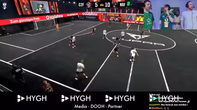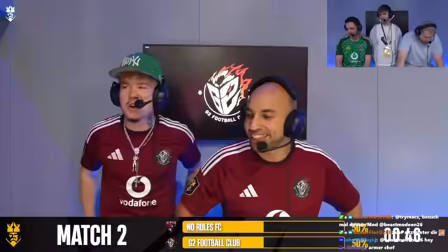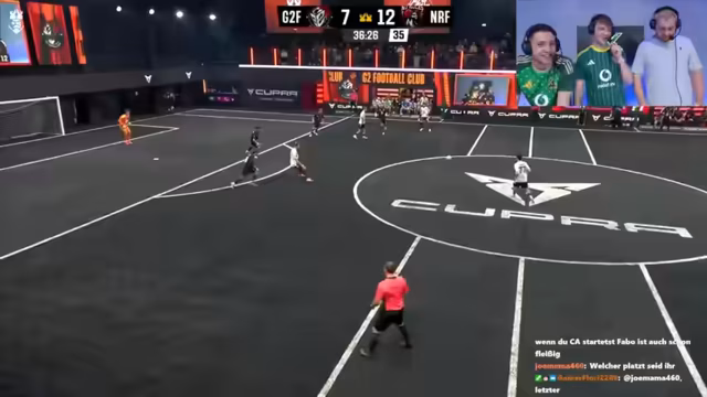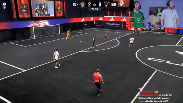 01:29:01Nach einer kurzen Kamerapause beginnt das Spiel. Die Spieler beider Teams werden vorgestellt, wobei der Streamer und Niki die Spieler ihres Teams von rechts nach links aufzählen: Cedric, Bilal, Amo, Leon, Johnny, Niklas, Tambo, Gilbert, Tanner, Furkan und Marcel Heller. Chefstrobel hat Schwierigkeiten, die Namen seines eigenen Teams korrekt aufzuzählen, was zu Belustigung führt. Er kann nur wenige Namen nennen, wie Daniel und Stanovic, und verwechselt sogar den Namen eines Profispielers (Seidel). Trotzdem wird die Animation des Spiels gelobt und die Spannung auf das entscheidende Match betont, da der Verlierer den letzten Platz in der Kings League belegt. Das Spiel beginnt mit Tambo im 1 gegen 1.