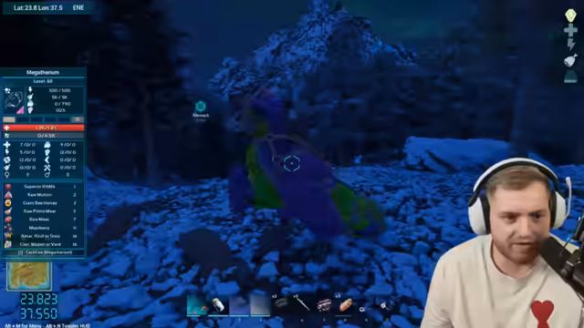 01:34:38Das Team sucht weiter nach den geforderten Dinosauriern, darunter ein hochleveliges Faultier (Weibchen) und ein Megatherium. Es werden mehrere Tiere gesichtet, jedoch sind viele ihrer Stats (Angriff) nicht optimal. Parallel wird ein kritisches Ressourcenproblem offensichtlich: Es fehlt komplett an Metall, Stein und Flint. Dies wird als dringendes Problem erkannt, da es die Herstellung von wichtigen Gegenständen blockiert. Die Gruppe muss eine Lösung für den Metallmangel finden, bevor sie ihre Ziele weiterverfolgen kann.