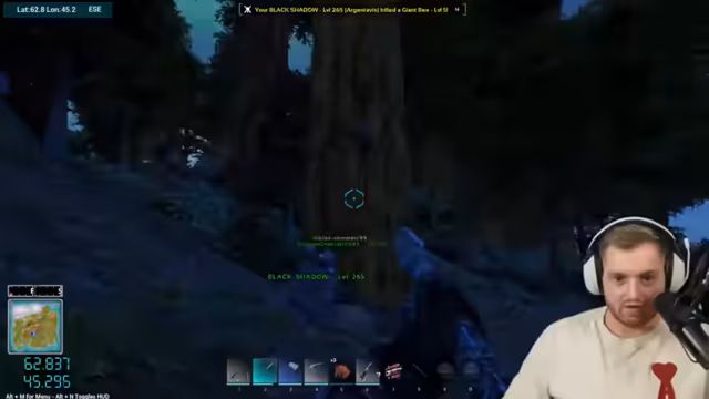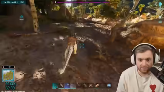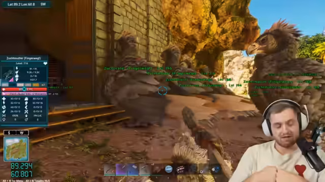 02:07:55Die Mannschaft entdeckt mehrere hochstufige Dinos in der Umgebung, darunter einen Daedon auf Level 120, einen Karnosaurus und einen Quetzal. Es entsteht eine Diskussion über die richtige Vorgehensweise: soll ein 125er Kanu getötet werden? Besondere Aufmerksamkeit gilt einem angeblichen Charotodaunus, der laut Chat sehr selten und groß ist, jedoch auf einem sehr niedrigen Level 15 spawnen soll. Das Team beschließt, solche schwachen Exemplare zu töten, damit stärkere respawnen können.