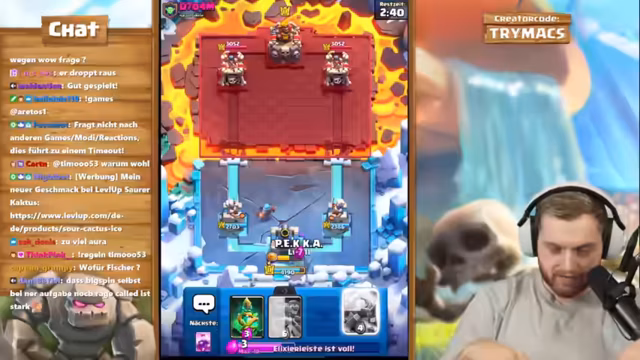 00:51:42Der Stream konzentriert sich intensiv auf das Spielen von Clash Royale mit einem Goblin Giant Deck. Er analysiert Spielzüge, zyklische Karten und die Notwendigkeit von Cursed Rage für Druck. Nach einer Niederlage wird ein neues Spiel begonnen und das Deck als absoluter Rotz bezeichnet, wobei er betont, dass es sich um ein Meta-Deck handelt. Es folgen detaillierte Anweisungen zur Handhabung von Karten wie P.E.K.K.A., Goblin Giant und Minipacker, um Gegner unter Druck zu setzen und das Spiel zu gewinnen.