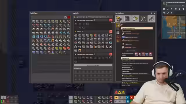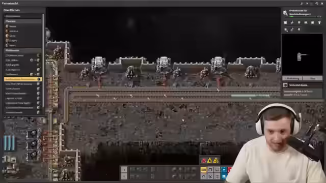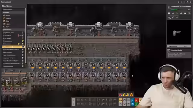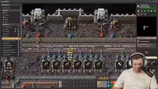 10:03:53Der Fokus verlagert sich auf den 'Aquila-Ficker', einen Raketenwerfer zur Verteidigung. Der Streamer erkennt ein Problem: der Ficker produziert zu viele Raketen, verstopft sich selbst und schießt sie wieder hoch, was eine massive Ressourcenverschwendung darstellt. Er versucht, die Produktion einzustellen, stellt aber fest, dass der Ficker Raketen weiter anfordert und sich selbst blockiert. Er muss die Raketenproduktion stoppen und die Logistik überarbeiten.