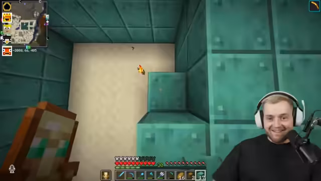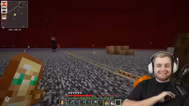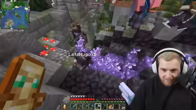 02:56:07Ein Spieler äußert Scham darüber, eine einfache Redstone-Technik kompliziert geplant zu haben, obwohl ein Dropper die Lösung gewesen wäre. Die Aufmerksamkeit richtet sich jedoch schnell auf Hugo, der im Spawn gefangen ist. Die Spieler beschließen, Hugo mit einer Herde schreiender Ziegen und Eiern zu belästigen. Es wird diskutiert, wie man am besten zu ihm gelangt und welche Gegenstände man ihm zuwerfen kann. Trotz der Versuche, ihn mit Ziegen und Eiern zu nerven, gelingt es Hugo, mithilfe einer Chorus-Frucht aus seinem ursprünglichen Gefängnis auszubrechen, nur um in einem noch größeren, aber scheinbar angenehmeren Gefängnis zu landen. Die Spieler sind überrascht und amüsiert über Hugos unerwarteten Ausbruch, erkennen aber auch, dass sie ihm nun nicht mehr helfen können, da er sich in einem Bereich befindet, aus dem es keinen offensichtlichen Weg gibt.