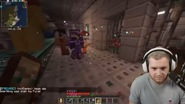 05:49:37Es wird über zukünftige Events gesprochen, wie das Fliegen mit Tieren in die Basen der Gegner. Der Streamer hat Probleme, auf den Golem zu gelangen, da das Wasser, das er zum Hochkommen benutzt hat, verschwunden ist. Er bittet um Hilfe, um Wasser von oben zu bekommen. Während des Baus werden Kämpfe zwischen anderen Spielern am Fuße des Golems beobachtet, insbesondere zwischen Chef Strobel, Kuba und Noisy. Die Kämpfe werden als 'episch' beschrieben. Die Platzierung von Shroomlights als Leuchtblöcke aus den Nether-Bäumen wird erklärt, wobei die Schwierigkeit des Farmens und Tradens dieser Blöcke hervorgehoben wird. Es wird auch über die Platzierung von Froglights gesprochen, die aufgrund ihres Musters eine präzise Ausrichtung erfordern. Die Gunpowder-Farm wird thematisiert, wobei die Effizienz aufgrund von Pauls Entnahme und einer möglichen falschen Platzierung des Streamers in Frage gestellt wird. Die Slime-Farm wird als unrealistisch eingeschätzt, um den Boden vollständig zu füllen, es sei denn, Spark würde einen Autocrafter bauen. Die Blaze-Farm ist ebenfalls ineffizient. Es wird festgestellt, dass die Augen des Golems fertig sind und er langsam eine 'Seele' bekommt. Die Notwendigkeit, weitere Bulbs zu craften und Froglights zu platzieren, wird besprochen. Die Sounds der Minecraft-Blöcke werden als 'geil' empfunden. Die Idee, den gesamten Golem an- und ausschalten zu können, wird diskutiert, aber aufgrund von Lags und technischen Einschränkungen als nur für die Vorderseite des Golems machbar erachtet. Die Größe des Golems wird erneut betont, wobei das gesamte Infinity Castle in seinen Kopf passen würde. Das Design des Kupfergolems wird gelobt, besonders bei Nacht, wenn er leuchtet. Die Antenne des Golems wird als nächstes großes Bauprojekt genannt, das voraussichtlich 30.000 Kupfer kosten wird. Die Idee einer Mobfarm auf der Schulter des Golems wird diskutiert, aber ein 'Lande verbot' wird ausgesprochen. Es wird über ein mögliches 'Kupferklopfer-Event' am nächsten Tag gesprochen, bei dem Teams gegeneinander antreten, um oxidiertes Kupfer in normales Kupfer zu verwandeln, mit Diamanten und Nether Debris als Belohnung. Der Streamer kündigt an, die Preise für dieses Event zu erhöhen und danach noch an der Gunpowder Farm zu arbeiten. Der Stream wird beendet, und die Zuschauer werden zu Fabo geroutet.