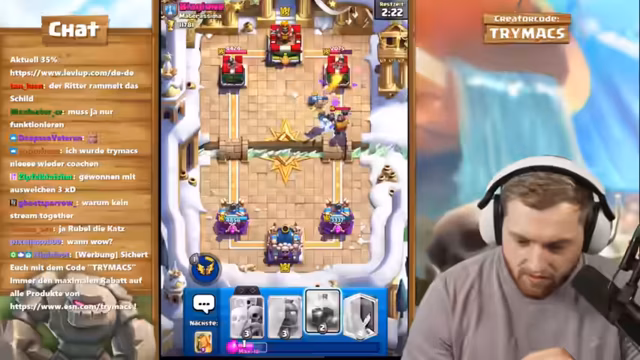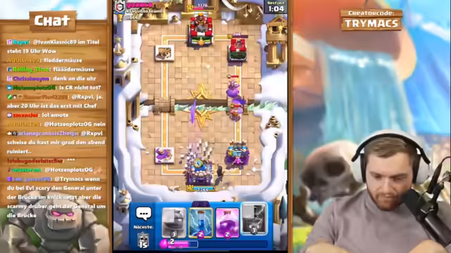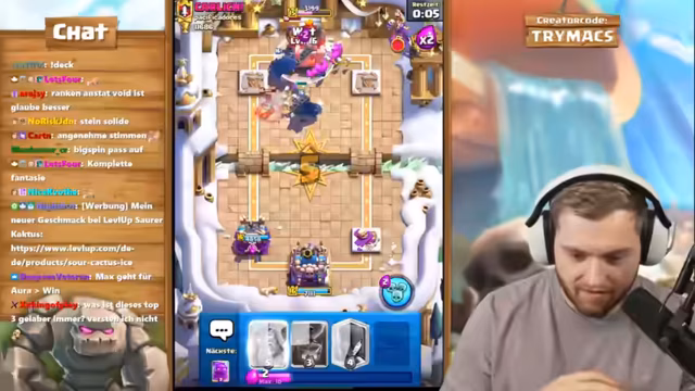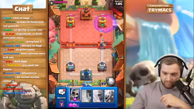 02:01:36Nachdem ein Spiel trotz guter Performance verloren geht, äußert der Streamer Frustration. Er selbst spielt das Friedhof-Deck als 'Haufen Scheiße', kann aber trotzdem Türme reißen. Einem Gegner wird vorgeworfen, ihn innerhalb von acht Sekunden zwei Türme einreißen zu können, mit einem offensivsten Deck. Es folgt ein intensives Verständnisproblem zwischen Streamer und Zuschauer über Siegbedingungen und die Taktik des Gegners.