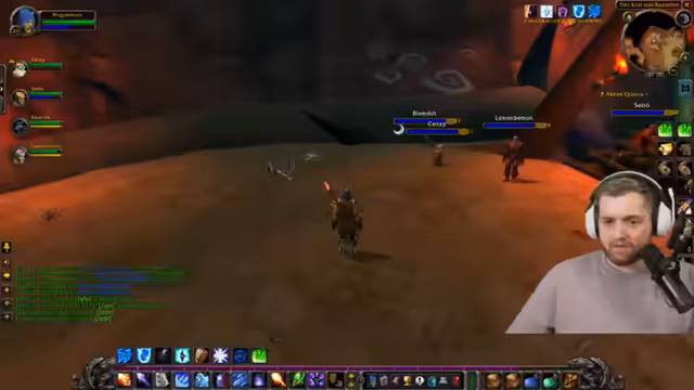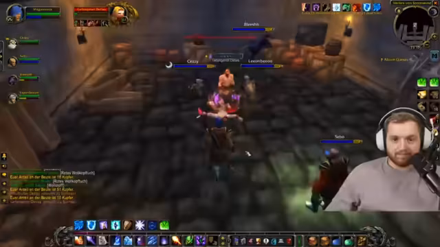 06:46:21Die Gruppe für den Dungeon ist eine ideale Kombination aus Mage, Driude, Priester, Schurke und Tank. Nach der Orientierung in der Umgebung, bei der ein Fahrstuhl nach unten benutzt wird, wird ein wichtiges Questitem aufgesammelt, das für die Dungeons-Passierbarkeit benötigt wird. Es gibt Koordination bezüglich des World Buffs, der in der Gruppe priorisiert wird, da er für den Dungeon entscheidend ist.