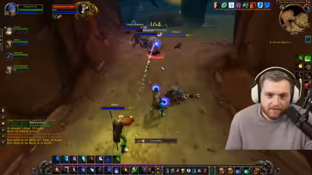 04:49:40Nach der dramatischen Verhandlung wird das Gameplay fortgesetzt. Die Gruppe kämpft sich durch einen Mob-Spawn, um ihre Quests abzuschließen und XP zu sammeln. Der Streamer gibt seine Enttäuschung über das Uris aus und äußert, dass es allein aus Content-Gründen schuldig hätte sein müssen. Er kontrastiert dies mit einer hypothetischen Strafe im Stil eines öffentlichen Demutsakts in WoW, wie es andere Gilden praktizieren. Parallel dazu wird das Gameplay fortgesetzt, während der Streamer über Mana-Probleme und seine Ausrüstung spricht.