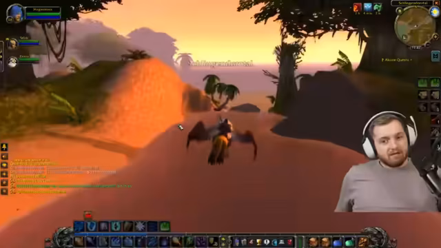 06:33:03Die Stimmung bleibt locker und humorvoll. Der Streamer 'Chef Strubel' wirft 'Chef' und 'Jeff' mit Shouts und einem 'Shame'-Ruf im Team. Die Gruppe setzt per Schiff nach Kalimdor über. Ein kleiner Wettbewerb entsteht, wer als Erster das Schiff verlässt. Dabei wird der Chat-Befehl '/knie' (engl. '/kneel') genutzt. Während der Fahrt gibt es weitere humorvolle Kommentare über den Geschmack von gekochten Tortellini und die Landschaft in WoW.