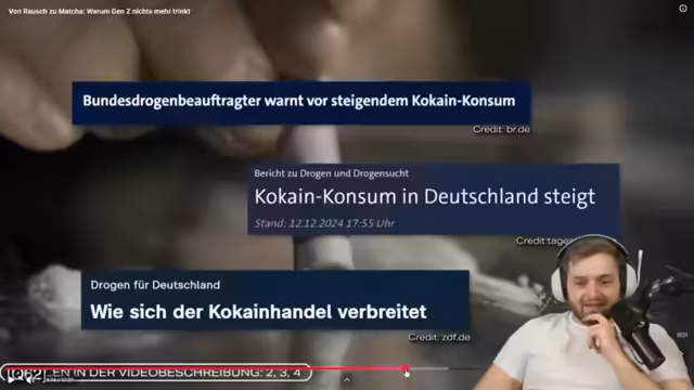 00:37:48Der Streamer reagiert auf das Video 'Vom Rausch zu Matcha' und diskutiert den Wandel des Alkoholkonsums zwischen den Generationen. Er stellt fest, dass die Gen Z signifikant weniger Alkohol konsumiert und dies mit dem Perfektionsanspruch auf Social Media in Verbindung bringt. Kritisch hinterfragt er den Trend zu 'Sober Raves' und befürchtet, dass ein übertriebener Fokus auf Produktivität und Einsamkeit zu einer 'kulturellen Eiszeit' führen könnte.