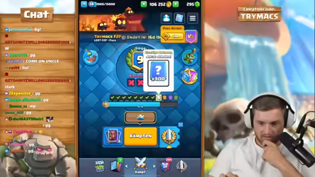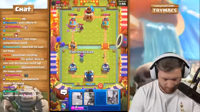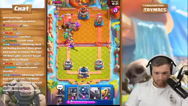02:48:21Der Stream setzt sich mit Clash Royale fort. Der Streamer ist auf seinem Free-to-Play-Account und hat das Ziel, 10.000 Trophäen zu erreichen. Er erwähnt das neue Clan-Event, bei dem alle Clanmitglieder zusammenarbeiten müssen, um Belohnungen zu erhalten. Interessierte Zuschauer können sich bewerben, dem Clan beizutreten. Sam ist weiterhin als Coach anwesend und gibt Tipps während des Spiels.