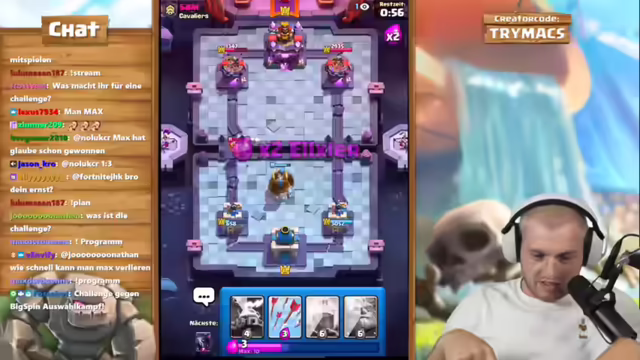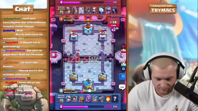 01:57:17Es beginnt eine Clash Royale Challenge zwischen BigSpin und trymacs auf ihren Free-to-Play-Accounts. Gespielt wird ein Skelett-Armee-Evo-Auswahlkampf, bei dem jeder die Karten des anderen auswählt. Der Einsatz sind 10 Sub-Gifts. Die Regeln und der Ablauf der Challenge werden erklärt, einschließlich der Auswahl der Karten und der Bedingungen für den Sieg. Es wird diskutiert, ob die Karten des Gegners während der Auswahl sichtbar sein sollen und wie dies technisch umgesetzt werden kann. Es wird vereinbart, dass derjenige gewinnt, der zuerst drei Niederlagen hat oder bis eine bestimmte Uhrzeit mehr Niederlagen angesammelt hat. Die erste Kartenwahl beginnt, wobei trymacs die ersten Karten für BigSpin auswählt und die Gründe für diese Entscheidungen erläutert.