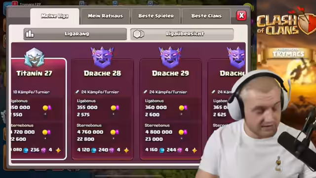 00:04:54Nach dem Intro wechselt der Streamer zu Clash of Clans und stellt das Ziel für den Stream vor: Er möchte vom Weltmeister Itzu coacht werden, um in die Legenden-Liga aufzusteigen. Die Vorfreude auf den neuen Ranked-Modus, den neuen Rathaus 18 und das kommende Event sind zentrale Themen. Der Streamer erklärt, dass er mit seinem Max-Account automatisch in Liga 27 startet und sein Ziel Liga 31 ist, um an doppeltes Sternerz zu kommen, jedoch ist der Weg in höhere Ligen deutlich schwieriger.