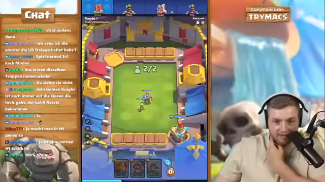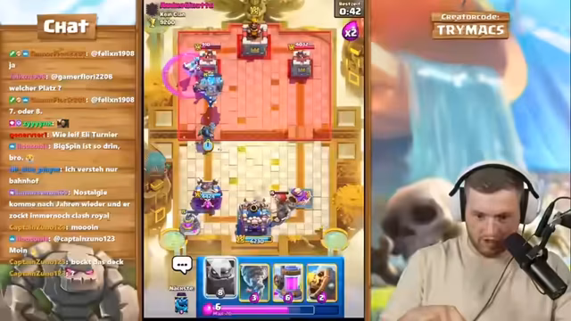 06:14:39Anfangs bewertet der Streamer verschiedene Clash Royale-Truppen. Er stellt fest, dass Demos und Orgments sich erst nach dem Freischalten aller Teile richtig entfalten können. Des Weiteren wird der Pekka als wenig effektiv angesehen, da er sich bei Angriffen selbst tötet. Giant Skeleton und Bombe werden als starke Truppen bewertet, die die gegnerischen Linien aufbrechen können. Es werden auch unterschiedliche Kombinationen wie Kyure Barbar, Queen und Bogenschützen oder Clan und Rächerin als Taktiken erörtert.
