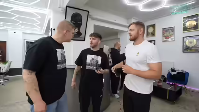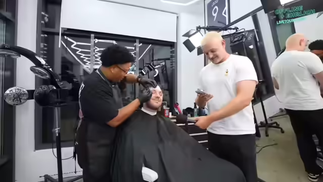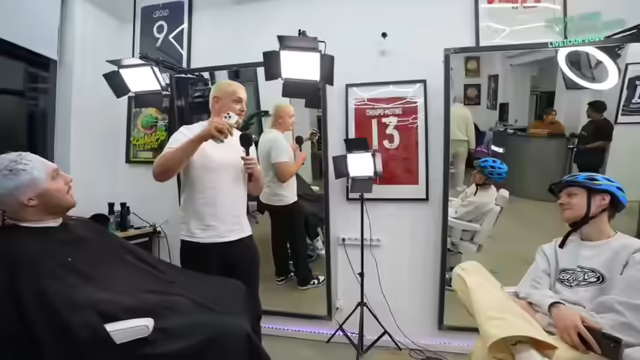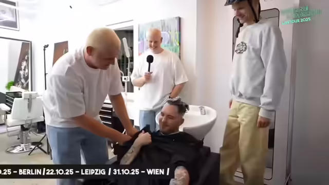 02:15:48Die Gruppe erreicht den Friseursalon Ridge of Art in Hamburg, wo eine besondere Aktion geplant ist: Flo und Max werden sich die Slim Shady M&M Frisur verpassen lassen, komplett blond und kurz, während Chef Strähnchen bekommt. Die Idee entstand aus einer Diskussion über Streaming-Bestrafungen und Haarveränderungen. Der Ursprung der Frisur wird ergründet und die Vorfreude auf das Ergebnis geteilt. Es werden 100 Nuggets für die Gruppe bestellt, und die späte Ankunft kurz vor Ladenschluss wird thematisiert. Diskussionen über die Unannehmlichkeiten beim Friseur und die möglichen Auswirkungen des Blondierens auf die Kopfhaut entstehen. Max wird noch nie bei so einem krassen Barber gesehen. Max äußert sich zuversichtlich bezüglich der bevorstehenden Haarveränderung, während er sich fragt, wie er mit blonden Haaren aussehen wird. Es wird überlegt, ob man bei Chef die Augenbrauen in der Mitte wegzumachen soll. Es werden 40 Nuggets bestellt und über die passenden Soßen diskutiert. Es wird darüber gescherzt, ob man mit dem Rasierer über den Kopf fahren darf. Flo wird nach seiner Meinung mit und ohne Bart gefragt, während Max' Haut als sehr trocken beschrieben wird. Es wird über die Dauer des Haarefärbens diskutiert und Max' jugendliches Aussehen ohne Bart hervorgehoben.
