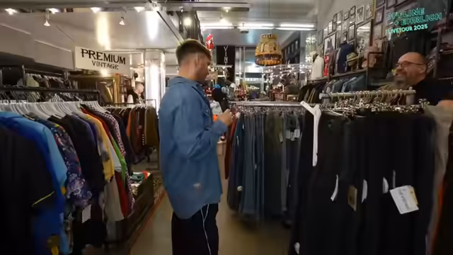 00:11:08Die Gruppe erreicht den Second-Hand-Laden und beginnt mit der Erkundung. Es gibt eine Vielzahl von Hemden, Jacken und anderen Kleidungsstücken. Trymacs zeigt verschiedene Outfits und versucht, die Gruppe zu überzeugen. Sascha gibt Styling-Tipps und die Gruppe diskutiert über passende Outfits und Accessoires für die Tourauftritte.