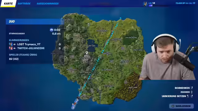02:45:03Nach einer kurzen Unterbrechung wird das Fortnite-Spiel fortgesetzt. Der Streamer und sein Julian arbeiten weiter daran, ihre Kills zu steigern und ihre Platzierung in der Rangliste zu verbessern. Sie konzentrieren sich auf den nächsten Drop und strategische Loot-Ziele, um die nächsten Gegner zu eliminieren.