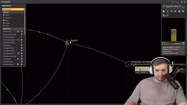 07:16:13Das 'Todesschiff' startet seine Reise durch das Sonnensystem. Der Streamer kämpft mit technischen Problemen und muss seine Schiffsgeschwindigkeit ständig anpassen, um nicht gegen Asteroiden zu zerschellen. Er stellt fest, dass sein Schiff autark funktioniert und mehr Raketen produziert, als es verbraucht. Er erreicht erfolgreich den Rand des Sonnensystems, sammelt die ersten Brocken von Promethium und erkämpft sich schließlich den Sieg im Spiel, indem er eine interstellare Raumplattform entsendet. Trotz des offiziellen Siegs will er weitermachen, um die letzte Forschung abzuschließen und die Ressource vom zerbrochenen Planeten zu holen.
