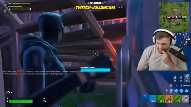 02:55:46Der Streamer fragt nach Sniper-Munition und Meds, während er feststellt, dass sein Partner tausend Meds hat. Sie diskutieren über die Notwendigkeit eines Jump Pads und der Streamer geht zum Loot Shop. Plötzlich wird er beschossen und erkennt ein Sniper-Team hinter sich. Er versucht zu entkommen, wird aber von Gegnern überrascht, die sich in seiner Nähe befinden. Er nutzt sein Jump Pad, um sich aus der gefährlichen Situation zu befreien. Der Streamer wird erneut gesnipet und die Situation wird als sehr schlecht eingeschätzt. Er vermutet, dass die Sniper von demselben Team stammen, das ihn zuvor angegriffen hat. Trotz des Delays im Stream werden die Aktionen des Streamers weiterhin verfolgt. Die Situation wird als ekelhaft beschrieben und der Streamer versucht, sich neu zu positionieren und zu überleben.