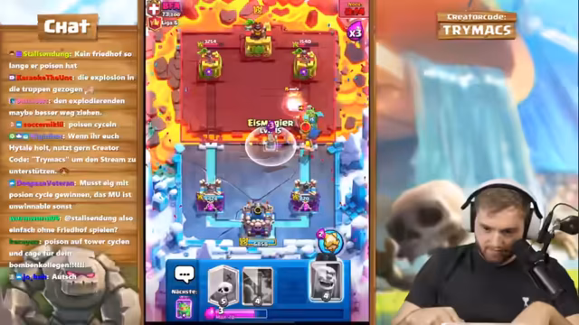 03:50:49Im Clash Royale-Teil des Streams geht es um den ultimativen Champion-Modus. Der Streamer benötigt noch 17 Siege mehr als Niederlagen, um den Rang zu erreichen. Er spielt ein Deck namens 'Fantastisch', das als stark, aber mit Schwächen gegen bestimmte Decks wie 'Hyper-Spam' und 'Rekruten' beschrieben wird. Die Erklärungen zu den Spielzügen sind detailliert, konzentrieren sich auf das Überleben, das Mischen von Karten und den effektiven Umgang mit dem Friedhof, um Damage zu machen und den Gegner unter Druck zu setzen.