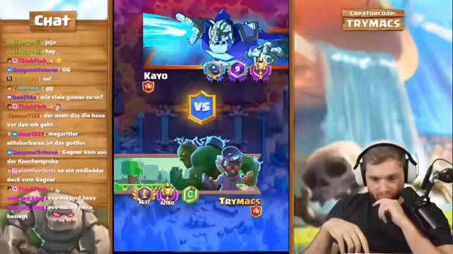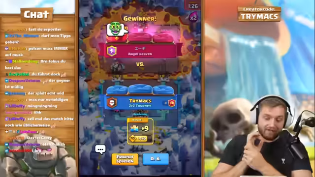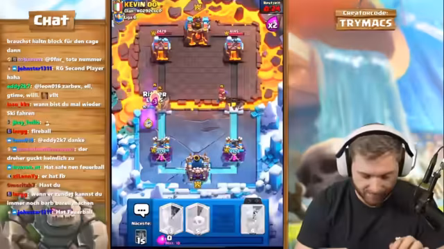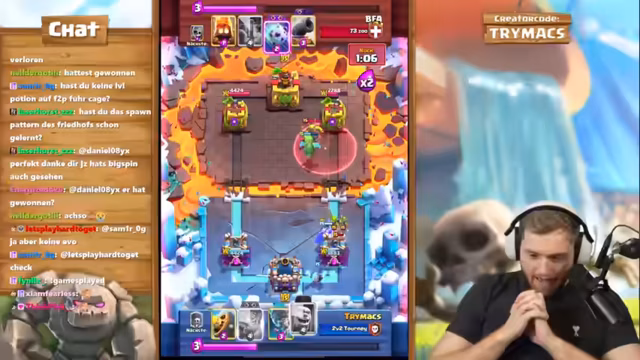 05:43:42Nach der Niederlage gegen das alte Friedhof-Deck muss das Team sich einem neuen, unbekannten Deck stellen: Giant Skeleton mit Curse, Evo Zap und Pekka. Der Streamer gibt zu, seine größte Schwäche sei es, die Zauberkarten des Gegners nicht zu kennen. In diesem Spiel werden strategische Entscheidungen getroffen, wie der Einsatz von Nado und Baby Dragon, um den Giant Skeleton zu verteidigen. Trotz eines leichten Elixier-Rückstands und des Risikos, dass der Gegner am Turm zündet, gelingt es, durch eine kluge Kombination aus Ritter, Nado und精准em Timing das Spiel sicherzustellen und in die Doppelten zu kommen.