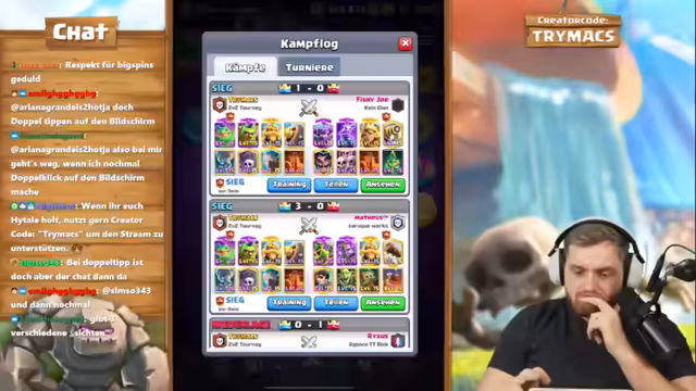 04:00:26Die ersten Spiele in Clash Royale sind von hohen Skill-Gegnern und schwierigen Matchups geprägt. Gegen ein 'Hyper-Bait'-Deck und ein sehr hohes Skill-Deck mit Level-14-Karten kämpft sich der Streamer hartnäckig durch. Seine Strategie basiert auf Damage über Poison und kontrolliertem Pushen. Trotz guter Einzelleistungen und klugen Kartenstapeln, verliert er einige knapp ausgespielte Games, was zu mentaler Erschöpfung führt. Er analysiert die Niederlagen und lernt für die nächsten Runden.