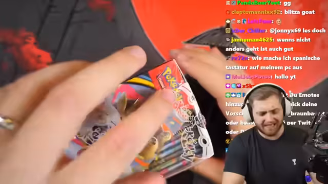 00:40:01Nach dem React-Segment wechselt der Streamer zum angekündigten Pokémon Opening. Er muss dabei anfänglich mit technischen Schwierigkeiten kämpfen, da der Greenscreen-Filter und die Kamera nicht korrekt funktionieren. Trotzdem startet er mit der Eröffnung eines neuen Kartensets im Pokémon-Sammelkartenspiel. Er zeigt eine ganze Box (Display) und betont, dass es ein seltenes Glurak als 'Chase Card' gibt, das in der höchsten Bewertung PSA 10 über 3.000 Euro wert ist, und äußert seine große Begeisterung für das anstehende 30. Jubiläum von Pokémon.