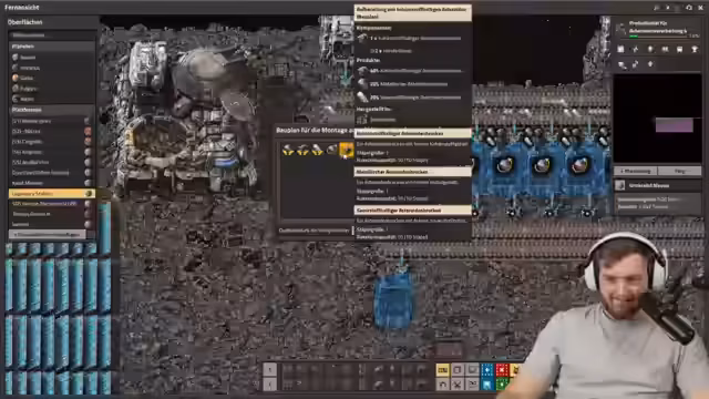 05:34:25Trymacs kämpft weiterhin mit dem Ölproblem und der Raketentreibstoffproduktion. Er stellt fest, dass die Level 4 oder 5 Asteroiden ihn irritieren und möglicherweise Schwierigkeiten verursachen. Das Problem mit dem Öl muss gelöst werden, um die Raketentreibstoffproduktion zu ermöglichen. Es wird überprüft, ob alle Ressourcen in Anbieterkisten gelagert werden. Trymacs optimiert die Aufbereitung von metallischen Asteroiden und benötigt dafür Raketentreibstoff, Leichtbauteile und blaue Schaltkreise. Der erste Flüssiggas-Tanker kommt an. Es wird ein System eingerichtet, um 3er Asteroiden zurückzulegen und größere als 3er weiterzuleiten. Der Raketenbrennstoff wird hergestellt, und es wird überlegt, wie die Produktion weiter optimiert werden kann. Trymacs stellt fest, dass die Forschung für Projektilwaffen schnell voranschreitet. Es gibt ein Problem mit Strängen, die sich in den Konkret eingegraben haben. Trymacs überlegt, Gas in Festbrennstoff umzuwandeln, um es für die Raketen zu nutzen. Die bestehenden Filter werden als unnötig erachtet, da die besseren Sachen ohnehin weitergegeben werden. Es gibt weiterhin Probleme mit der Raketentreibstoffversorgung, da seit 30 Minuten nichts mehr angekommen ist.