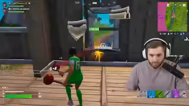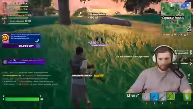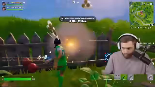 03:04:12Der Streamer spielt Fortnite mit anderen Spielern und interagiert mit Zuschauern. Es werden Gespräche über verschiedene Waffen und Spielstrategien geführt. Besonders Katana-Schwerter werden erwähnt. Der Streamer erklärt den Zuschauern, dass Streamen als Hobby möglich ist, aber trotzdem zuerst Schule oder Ausbildung wichtig sein sollte. Interaktionen mit anderen Streamern wie Schradin und Young Castle werden ebenfalls gezeigt.