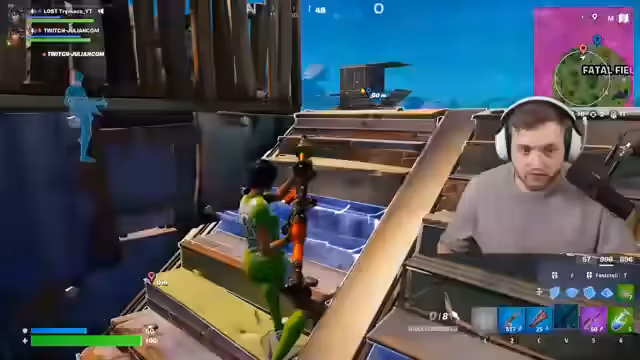 01:45:02Eine neue Runde beginnt und der Streamer nutzt die Double-Pump-Strategie, um Gegner erfolgreich zu eliminieren. Er stellt fest, dass die Ping-Probleme und das Team-Sniping in Fortnite ein großes Thema sind, was es ermöglicht, aggressiver vorzugehen. Mit den erbeuteten Waffen und Items wird ein Airstrip angegriffen, wo mehrere Kills erzielt werden. Die Runde endet mit dem Sprung auf den 2. Platz der globalen Rangliste.