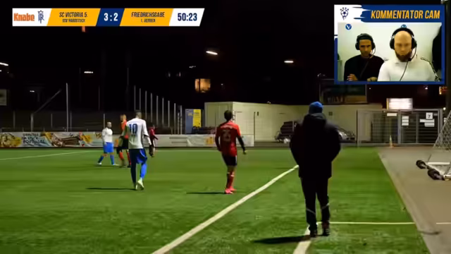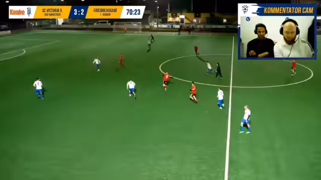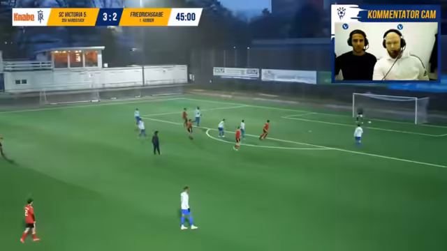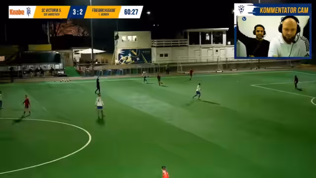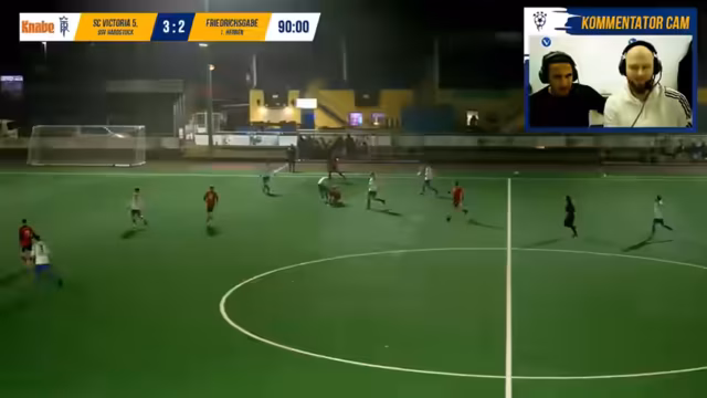 01:05:27Nach einer Phase, in der viel Platz für Tore war, fängt sich Friedrichsgabe und erzielt das 3:2. Die Situation wird als merkwürdig beschrieben, da der Ball dreimal hin- und herflutscht, bevor er ins Tor geht. Die Kommentatoren sind gespannt auf das Replay und die Halbzeitanalyse. Es wird angemerkt, dass die eigene Mannschaft in den letzten 10-15 Minuten an Bewegung vermissen lässt und unkonzentriert verteidigt, was zum Gegentor führt. Die Halbzeit wird erreicht, und die Kommentatoren fassen die erste Hälfte als durchwachsen zusammen. Es werden die drei Tore von SV Horzak und die zwei ärgerlichen Gegentore von Friedrichsgabe rekapituliert. Die erste Halbzeit wird als unterhaltsam und spannend beschrieben, aber die zweite Halbzeit wird als zäh und langweilig empfunden.
