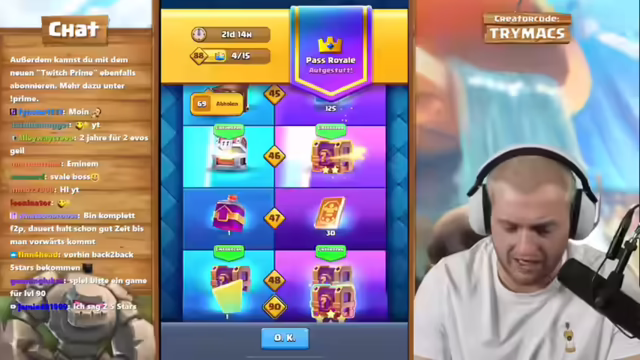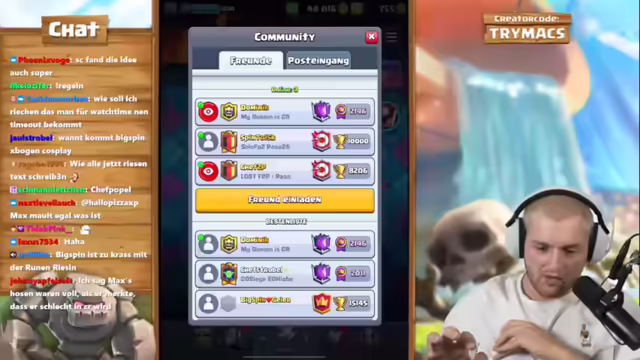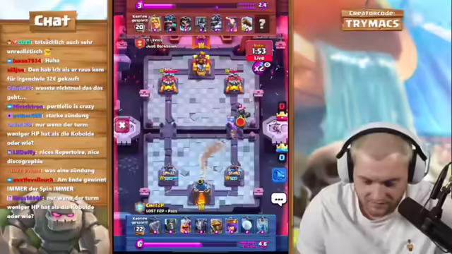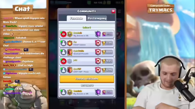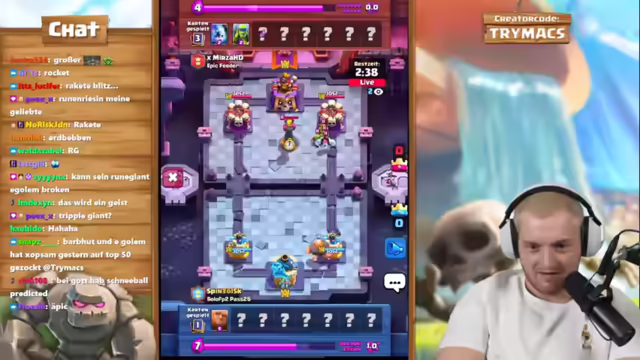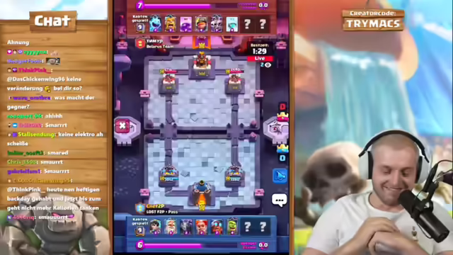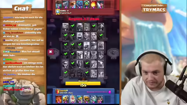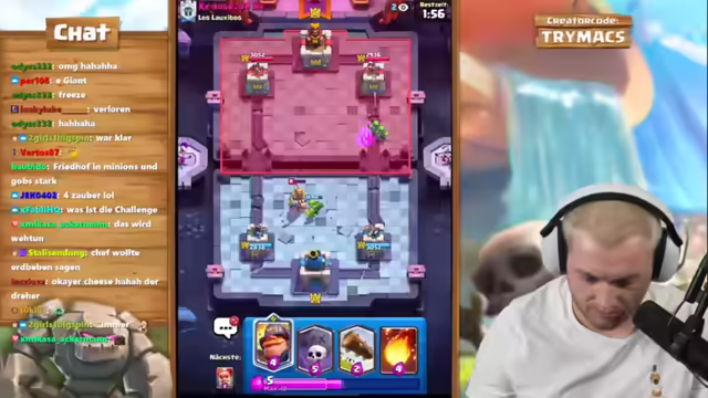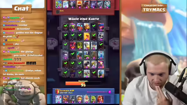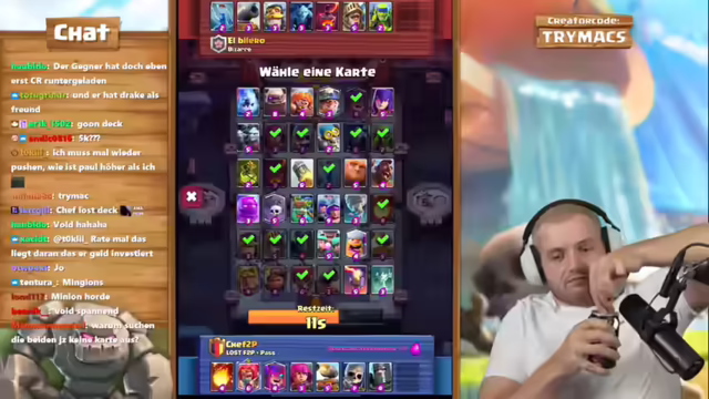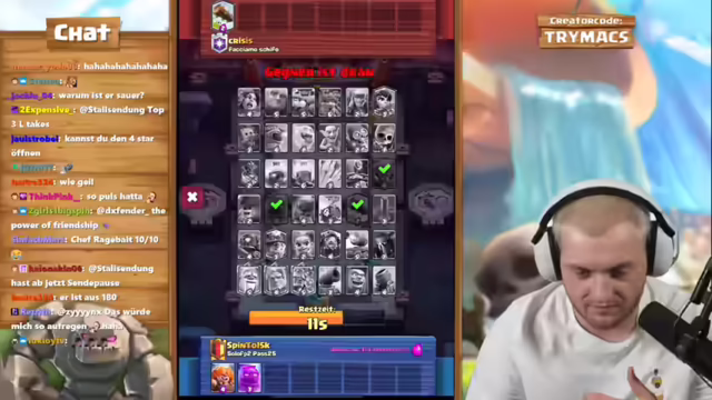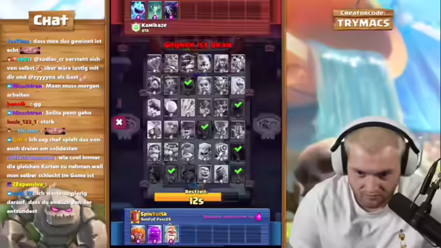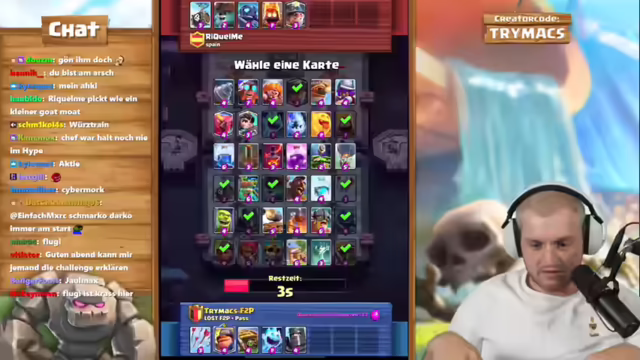 03:08:26Ich werde den Turbo Bait aktivieren und die Hexe picken, um die Hexe zu kontern, die der Gegner noch gar nicht hat. Ich wähle Minions. Ich werde dafür kritisiert, dass ich die Karte immer sehr hoch lobe. Ich habe gute Karten bisher. Ich wähle den leeren Zauber und den Prinz. Ich habe keine Windcondition. Ich hätte Bock auf den Golem und picke ihn. Der Gegner pickt die Hexe am Ende. Ich habe bessere Karten. Ich werde daran erinnert, dass ich einladen muss. Es ist sehr spät. Ich werde gefragt, wer einen Hypetrain an hat. Ich habe gewonnen und soll so ne Penner-Granate. Ich bin nach vier Monaten bei 8200 Free2Play, obwohl ich dreimal hintereinander 12-0 in der Grand Challenge gegangen bin. Ich picke die Hütte und einen Eisgeist, da es kein Barbell und kein Holz gibt.