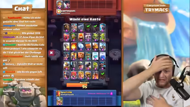 02:36:52Die Challenge beginnt offiziell. Der Streamer erklärt den Modus und die Regeln noch einmal im Detail für die Zuschauer. Chef Strobl wählt als Erster zwei Karten, gefolgt von Big Spin, der drei Karten für sich selbst wählt. Der Streamer wählt daraufhin zwei Karten für Big Spin. Die letzte Karte, die den Ausgleich schaffen soll, wird vom Zufall bestimmt. Die Stimmung ist angespannt und tryhard, da beide Seiten versuchen, das bestmögliche, aber auch das schwächstmögliche Deck für den Gegner zusammenzustellen.