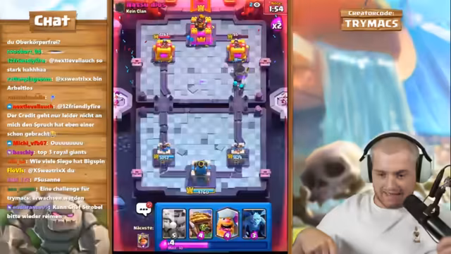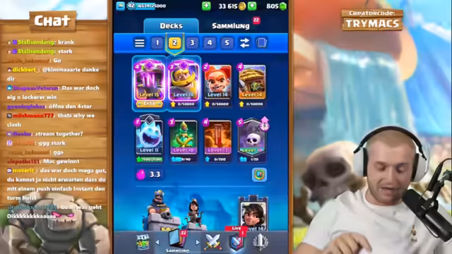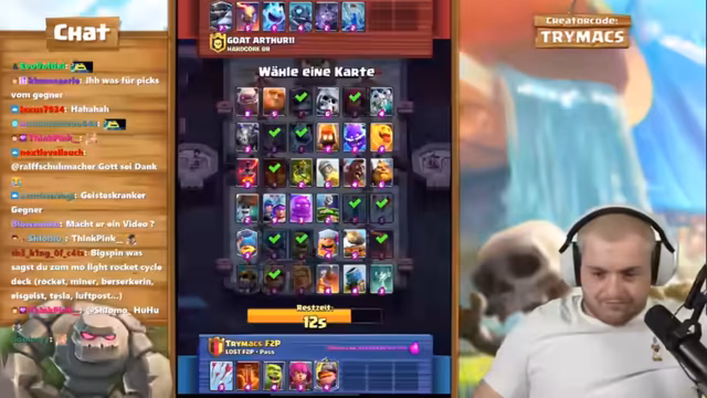 05:36:44Der Stream beginnt mit der Klärung von technischen Problemen, insbesondere bei den Mikrofoneinstellungen, die sich auf die Kommunikation auswirken. Danach startet ein Spiel aus der League of Legends. Es folgt eine Herausforderung mit Big Spin und Chef Strubel in Clash Royale, bei der ein intensives und teils frustrierendes Gameplay zu beobachten ist. Der Streamer kämpft mit seinem Deck und äußert seine Unzufriedenheit über die Performance und die Karten.