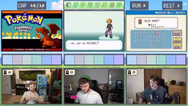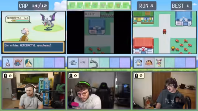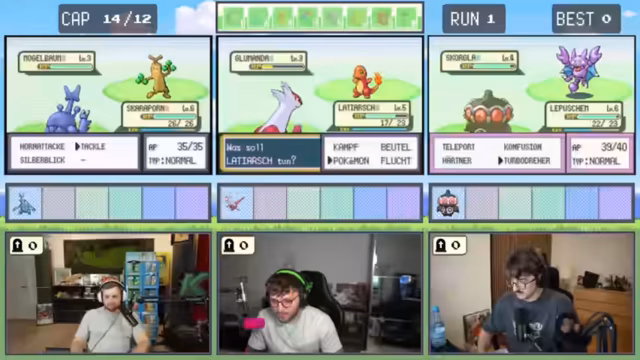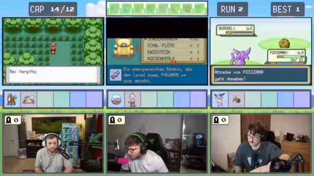 08:12:21Ein älterer NPC bietet den Spielern die Möglichkeit, für 500 Poké-Dollar ein Pokémon zu erwerben - es handelt sich um ein Porygon. Die Spieler nutzen die Gelegenheit und taufen es humorvoll auf Namen wie "Sacktax" und "Porygon 69". In der folgenden Route gelingt den Spielern ein glücklicher Fang eines Starter-Pokémon, das sie "Megagne" nennen. Ein weiterer Erfolg ist der Fang eines Panikon. Die Stimmung hellt sich deutlich auf, da die Spieler nun wieder über ein beträchtliches Team verfügen. Zudem finden sie weitere wertvolle Items wie einen EP-Teiler, während sie sich auf den nächsten Encounter vorbereiten.