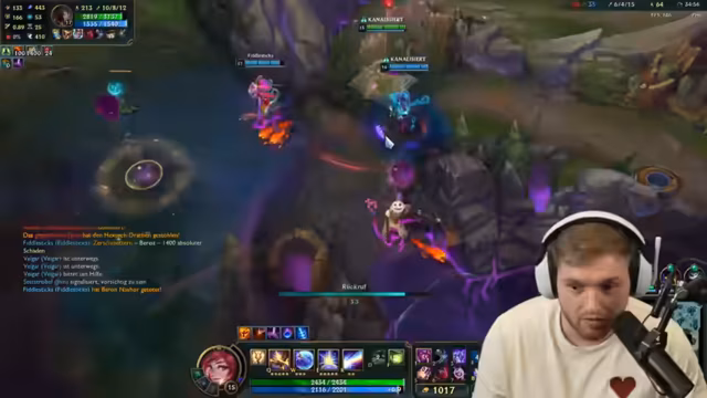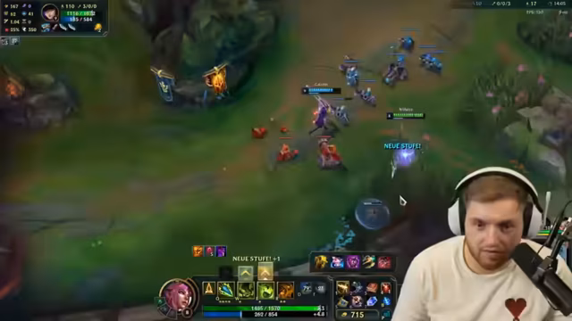 05:35:18Durch einen persönlichen Fehler, den Streamer als 'geisteskack' bezeichnet, stirbt er und macht sich selbst Vorwürfe. Der gegnerische Top-Laner, ein Darius, ist eine massive Bedrohung. Nach einem Teamfight verliert das Spiel durch einen gegnerischen Baron-Nashor an Schwung, was zu Frustration über die eigene Teamleistung und das Matchmaking führt.