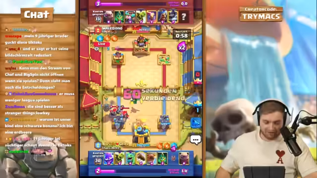 00:13:54Der Stream startet schließlich die angekündigte Clash Royale Trio Challenge mit Chef Strobel und Bigspin. Modus ist der Chaos-Challenge, bei dem zwei Augments pro Game und ein Deck mit einer austauschbaren Karte gewählt werden. Ein Subgift-Pot wird mit je zehn Einträgen gestartet. Der Streamer kommentiert das Spielgeschehen intensiv und kritisiert die oft sehr schlechten Augments, die Chef Strobel erhält, sowie dessen taktische Fehler.
