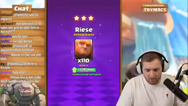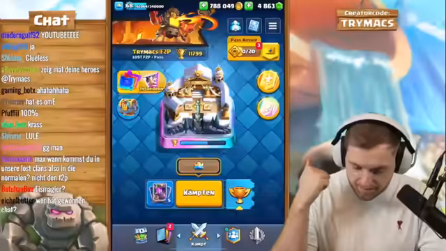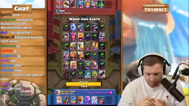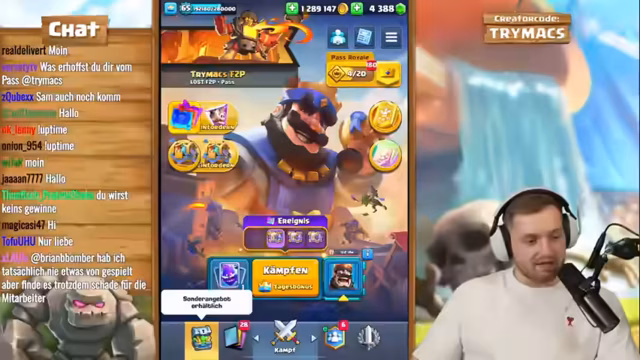 03:17:04Der Stream wechselt das Thema und konzentriert sich nun auf das Clash-Royalespiel Free-to-Play plus Pass. trymacs öffnet den Pass, der stark verbessert wurde und nun mehr Belohnungen, wie zum Beispiel garantierte Fünf-Sterne-Kisten, bietet. Er betont, wie wichtig es ist, diesen Pass als Free-to-Spieler zu maximieren, um konkurrenzfähig zu bleiben. trymacs zeigt sein Gold und seine gesammelten Ressourcen und beginnt, den Pass systematisch zu öffnen, um Karten zu maxieren. Er trifft strategische Entscheidungen darüber, welche Karten er verbessern sollte, und ist beeindruckt vom Wert des Passes, der ihm hilft, schneller an seltene Karten zu gelangen.