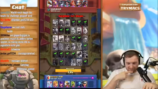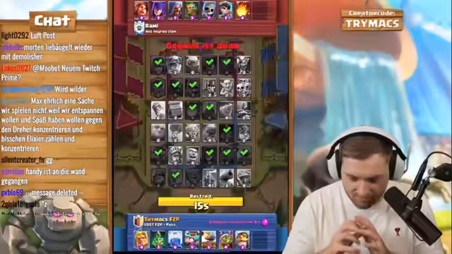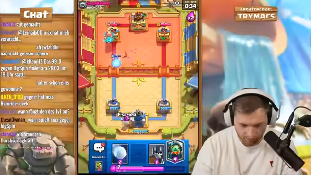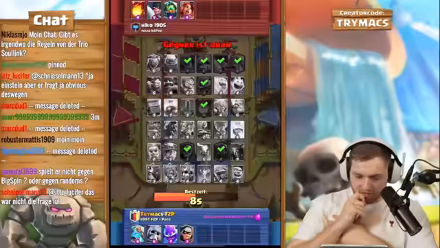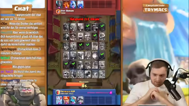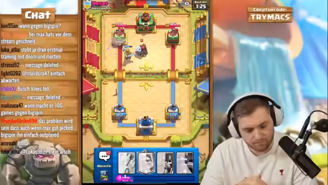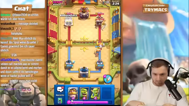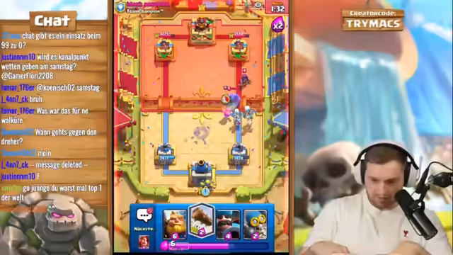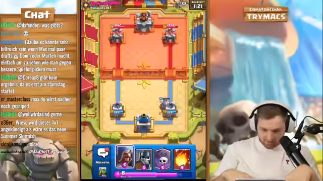 02:59:26Das Live-Stream-Segment beginnt mit einer intensiven Clash-Royale-Trainingssession, bei der trymacs, Doom und Morten gemeinsam an einem speziellen Deck arbeiten. Der Fokus liegt auf der Nutzung von Elite-Babaren, die als extrem stark und schwer zu besiegen gelten. trymacs analysiert den Gegner und stellt fest, dass dieser mit Babaren, Barbaran-Brücke und speziellen Fähigkeiten wie Lightning operiert. Streamer trymacs ist von der Stärke der Babaren beeindruckt und versucht, deren Angriffsmuster zu verstehen, während das Team gemeinsam an einem Spiel gegen einen starken Gegner arbeitet und dabei strategische Entscheidungen trifft.