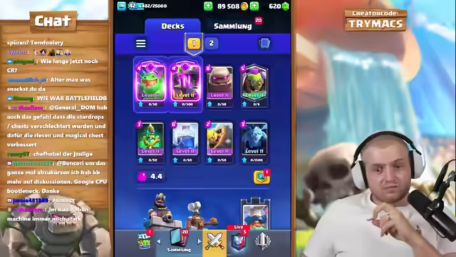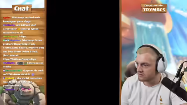 05:16:01Der Streamer startet eine Clash Royale Duo-Challenge mit Chef Strobel auf einem Free-to-Play-Plus-Pass-Account, mit dem Ziel, den Pass durchzuspielen und ein Opening zu veranstalten. Für jeden Sieg erhält Chef Strobel ein Sub-Gift. Der Streamer erinnert an Big Spins Erfolg mit 30 Sub-Gifts und hofft auf ein ähnlich gutes Ergebnis mit Strobel. Er macht auf den Royal Ghost Evo aufmerksam und wirbt für den Credit Code 'Trimix'. Es wird ein Golem-Deck gespielt, wobei der Streamer den Nado spielt, um den Drachen zu unterstützen. Nach anfänglichen Schwierigkeiten und knappen Spielen gelingen mehrere Siege in Folge, wodurch Chef Strobel zahlreiche Sub-Gifts erhält. Der Streamer lobt die knappen Comebacks und die Fähigkeiten seines Partners. Es werden verschiedene Strategien diskutiert und angepasst, um gegen unterschiedliche Gegnertypen zu bestehen.
