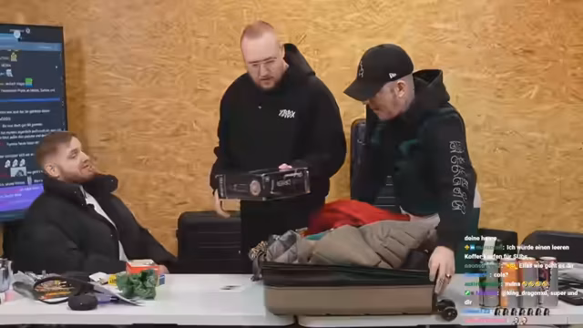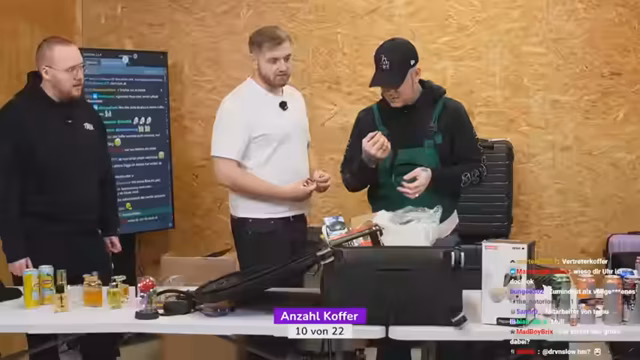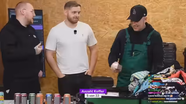 00:08:00Der Stream beginnt mit der Begrüßung der Zuschauer und der Ankündigung des Themas: ein gemeinsames Zollkoffer-Unboxing. Monte begrüßt den Zuschauer Zarrbex und den neuen Teilnehmer Max, auch Trimax genannt. Das Ziel des Streams ist das Auspacken verschiedener Koffer, die beim Zoll liegengeblieben sind, auf der Suche nach wertvollen oder ungewöhnlichen Gegenständen. Monte erwähnt die Kosten der Koffer, die je nach Größe und Gewicht zwischen 200 und 800 Euro liegen können.