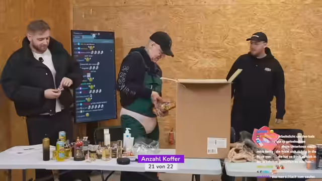 04:09:01Nachdem ein geplanter 'Superkoffer' ebenfalls enttäuschende Ergebnisse liefert und sogar gestaltet werden sollte, um wenigstens etwas Spannung zu erzeugen, suchen die Streamer nach einem spektakulären Abschluss. Das Highlight ist der Versuch, mehrere Parfümflaschen mit hohem Alkoholgehalt zu sprengen. Vorher wird jedoch ein Böller mit Reizgas entdeckt, was aus Sicherheitsgründen nicht zur Zündung gebracht werden darf. Die Aktion endet mit dem Abschuss der Parfümflaschen, die durchbrennen und für viel Rauch sorgen. Der Stream findet damit einen humorvollen, wenn auch chaotischen Abschluss.