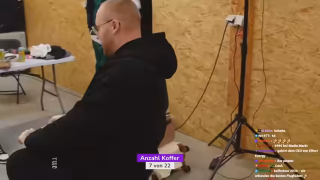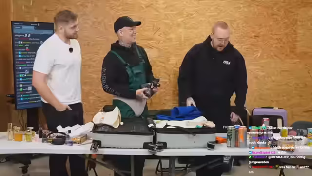 02:35:59Der Stream beginnt mit einer rauchigen Atmosphäre im Raum, da Feuerwerkskörper im Kofferraum detonieren und Rauch entwickelt. Monte und Zarbex öffnen einen ersten, unspektakulären Koffer, der unter anderem Kleidung, ein Geheimtäschchen von einem 'Kay-Fan' und auffälligen, aber wertlos erscheinenden Plastikschmuck enthält. Zarbex erwähnt, dass dies der teuerste Koffer war, aber der inhaltlich 'beschissenste', was eine erste Enttäuschung und die Notwendigkeit, positiv zu bleiben, signalisiert. Es wird ein Zufallskoffer geöffnet, der als 'neuchternd' beschrieben wird.