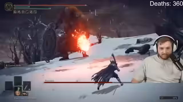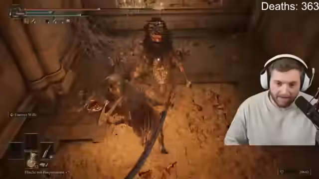 03:36:19Nachdem der Fire Giant in seine zweite Phase übergeht, wird er durch ein Bauchauge deutlich aggressiver und startet Kometenregen-Angriffe. Der Streamer muss seine Taktik anpassen, da die bisherigen Angriffe auf die Füße nicht mehr effektiv sind. Er konzentriert sich auf das Timing, um den Flammen- und Kometenangriffen auszuweichen, und muss dabei mehrere Tränke einsetzen. Es kommt zu kuriosen Momenten, in denen er den Boss trotz visueller Treffer keinen Schaden zufügt, was ihn frustriert.