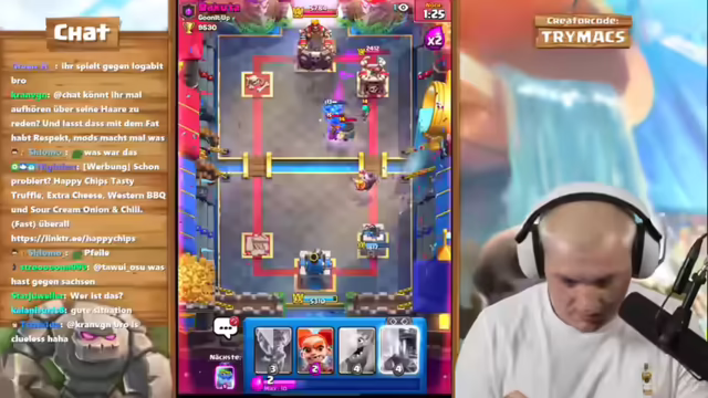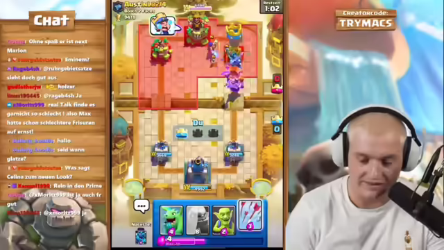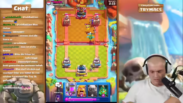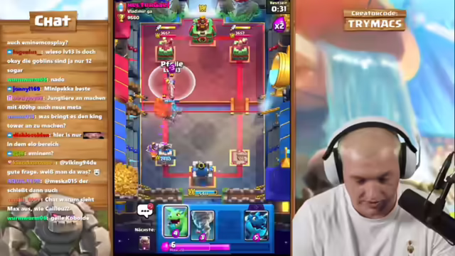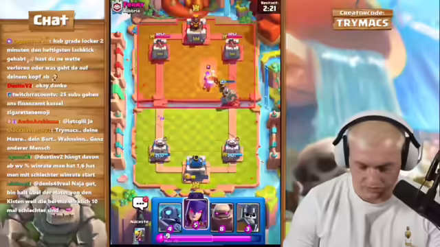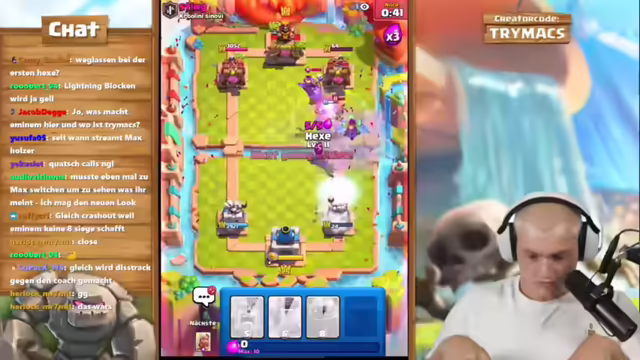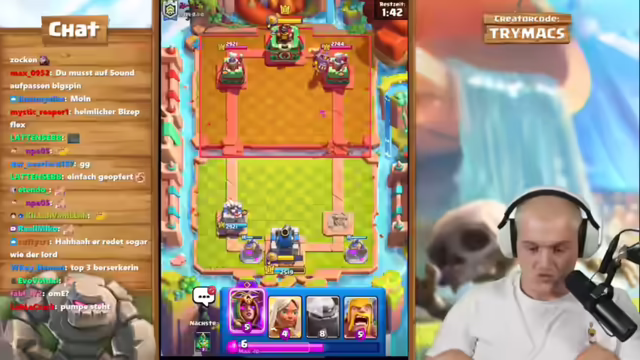 06:02:56Der Streamer analysiert spezifische Matchups und betont die Bedeutung von Guards gegen Gegner mit Schneeball, da dieser die Guards nicht effektiv kontert. Er erklärt, wie man gegen Drill-Decks mit Evo-Schneeball vorgeht, indem man zuerst eine Truppe platziert, um den Evo-Schneeball zu provozieren, und dann mit dem Barbarenfass den Drill abwehrt. Der Streamer gibt Ratschläge, wie man den Kobold am Turm abwehrt, indem man eine Einheit vor dem Turm platziert, um zu verhindern, dass der Kobold den Turm angreift. Es wird eine Nachricht von einem Zuschauer erwähnt, was zu einer Diskussion über den Chat führt. Der Streamer demonstriert, wie man in der frühen Elixierphase einen Push aufbaut und den Gegner unter Druck setzt. Er analysiert verschiedene Deck-Kombinationen und gibt Ratschläge, wie man gegen Pekka-Goblin-Jent-Decks vorgeht, indem man die Hexe und den Baby Dragon einsetzt, um die gegnerischen Truppen zu kontern. Der Streamer betont die Bedeutung, den Mini-Pekka abzulenken und die Hexe zu schützen, um einen Vorteil zu erlangen. Es wird die Notwendigkeit hervorgehoben, auf die Spielweise des Gegners zu reagieren und die eigenen Strategien entsprechend anzupassen. Der Streamer gibt detaillierte Anweisungen, wie man die Hexe effektiv einsetzt, um gegnerische Angriffe abzuwehren und den eigenen Turm zu schützen.