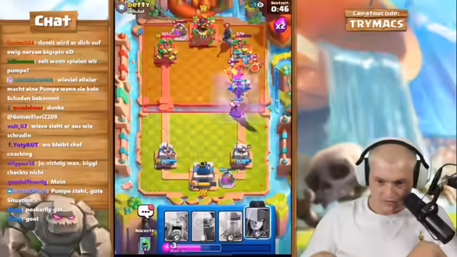 04:21:17Das Segment zeigt das Live-Coaching im Ablauf. Der Streamer gibt präzise Anweisungen während des Spieles, um Chef Strobel zu leiten. Er kritisiert gelegentlich Entscheidungen, wie das Spielen der Evo-Hexe an der falschen Position oder das nicht Folgen von Anweisungen, was zu unnotwendigem Schaden führt. Das Coaching ist interaktiv und beinhaltet Anpassungen im Spiel basierend auf den Aktionen des Gegners, insbesondere gegen Spiegel-Matchups oder Decks wie Graveyard. Trotz gelegentlicher Kommunikationsprobleme wird das Ziel verfolgt, das Deck bestmöglich zu spielen und die 10.000 Trophäen zu erreichen.