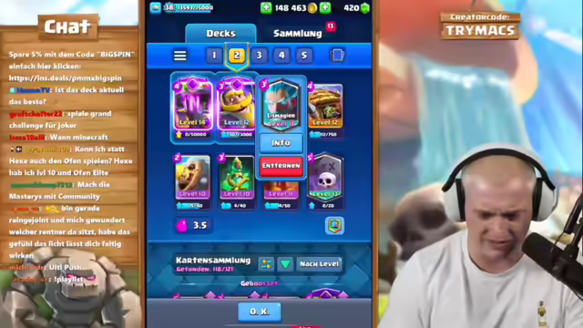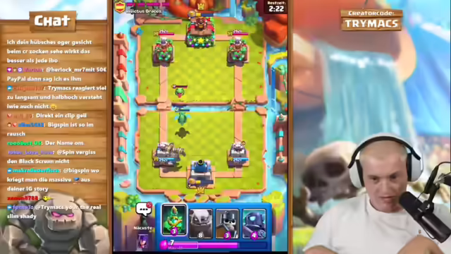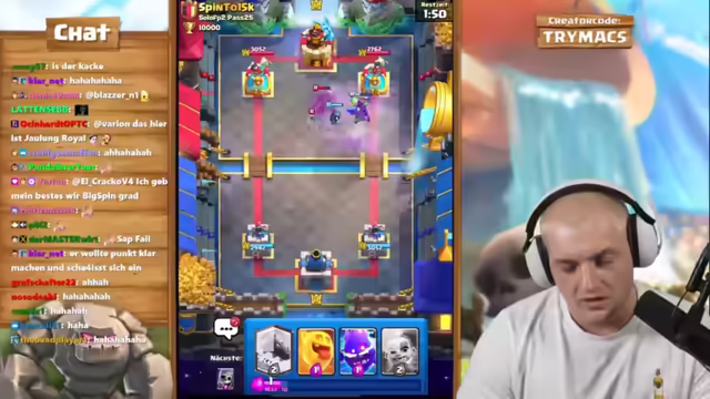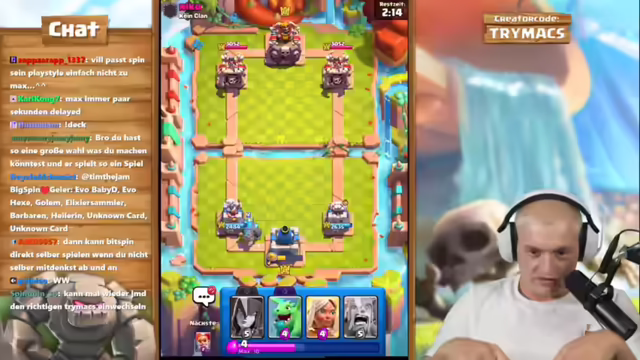 01:16:21Der Streamer äußert Frustration darüber, seit Wochen zu versuchen, 9.500 Trophäen zu erreichen, und erlebt eine Pechsträhne. Er bittet um Fokus und Coaching, um das Ziel gemeinsam zu erreichen. Die Belohnungen aus einer Kiste werden als schlecht bewertet, und der Streamer ist von der Zusammenstellung der Karten enttäuscht. Trotzdem wird der Fokus auf den nächsten Gewinn gelegt, und der Streamer gibt Anweisungen für den ersten Spielzug mit dem Ofen hinten. Es wird erwartet, dass der Gegner wieder eine Evo-Hexe spielt, und der Streamer gibt Anweisungen, wie man darauf reagieren soll. Der Ritter wird durchgelaufen gelassen und Kobolde an der Brücke platziert. Der Streamer gibt Anweisungen, wann man den Beserker vorpacken soll und wann man eine Hexe spielen soll. Der Streamer erklärt, wann man einen Golem in die Hexe spielen soll und wann man ihn auf die andere Lane spielen soll. Der Streamer erklärt, warum er Pfeile gemacht hat und warum das nicht so gut war. Der Streamer erklärt, warum die Reskits nicht auf den Golem abgefeuert haben. Der Streamer erklärt, warum der E-Dragon bei Reskits absolute Well bekommt.