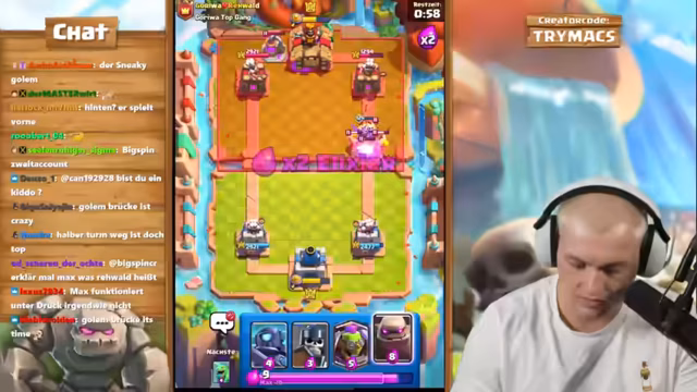02:48:34Ein gewonnenes Spiel wird vom Streamer als "unverdienter Sieg" seiner gesamten Clash-Royale-Karriere bezeichnet. Er analysiert eine späte Spielentscheidung, bei der der Golem falsch platziert wurde, was den gegnerischen Angruss ermöglichte. Des Weiteren wird ein Smurf-Account des Gegners identifiziert, der gezielt erstellt wurde, um in Turnieren zu punkten. Das Match-up gegen das Mighty-Miner-Deck als besonders schwierig beschrieben, da der Streamer keine effektive Antwort darauf hatte, außer mit Barbaren und der Hexe, was zu einem teuren und ineffektiven Trade führte.